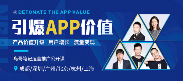 本周起,鸟哥笔记创始人亲自带队,与腾讯、易车网、樊登读书、口袋兼职等业内明星团队一起,开启引爆APP价值系列公开课,重点攻克流量变现、用户增长以及产品价值升级的问题。并在北京、深圳、广州、上海、杭州、成都6个城市巡回进行。