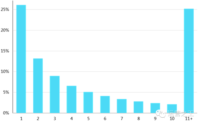从这个图中可以看到,在26.1%的情况下,用户安装APP以后,只打开一次后就不再使用该应用了。可见平均下来,一个应用的二次回访率不到75%。因此,如何提高用户打开APP的次数,是运营时应当关注的。