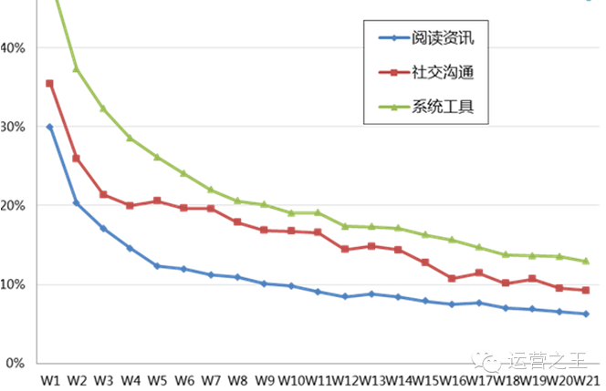APP获得一定用户以后,刚开始用户会比较多,随着时间的推移会不断有用户流失。留存率就是考查用户流失情况的指标。从相关数据报告可以看到,留存率随时间推移逐步下降,一般在3~5个月后达到稳定。其中阅读资讯、社交沟通、系统工具是留存率最高的三类应用,在4个月以后的留存率稳定在10%左右。留存率提高了,才会有更多的用户留下来,真正使用APP的用户才会越来越多。
