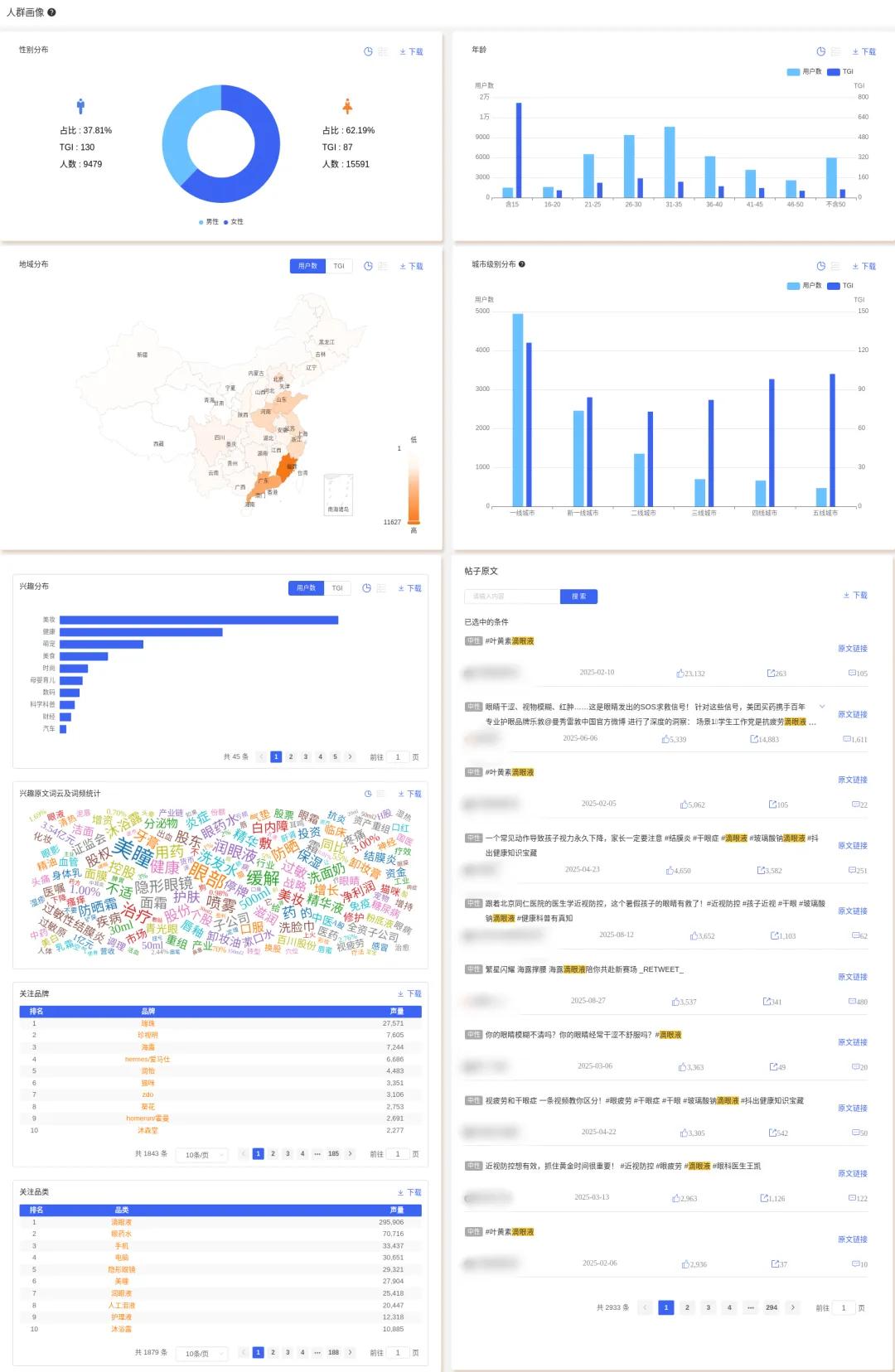 消费者兴趣偏好揭示潜在关联需求。美妆(TGI 4744)和健康(TGI 2348)兴趣显著,显示用户对"眼部护理"与"颜值健康"强关联。萌宠(TGI 349)和科学科普(TGI 329)人群需关注,可能衍生宠物用眼健康或功能性产品需求。这种兴趣图谱为跨品类营销提供方向。
