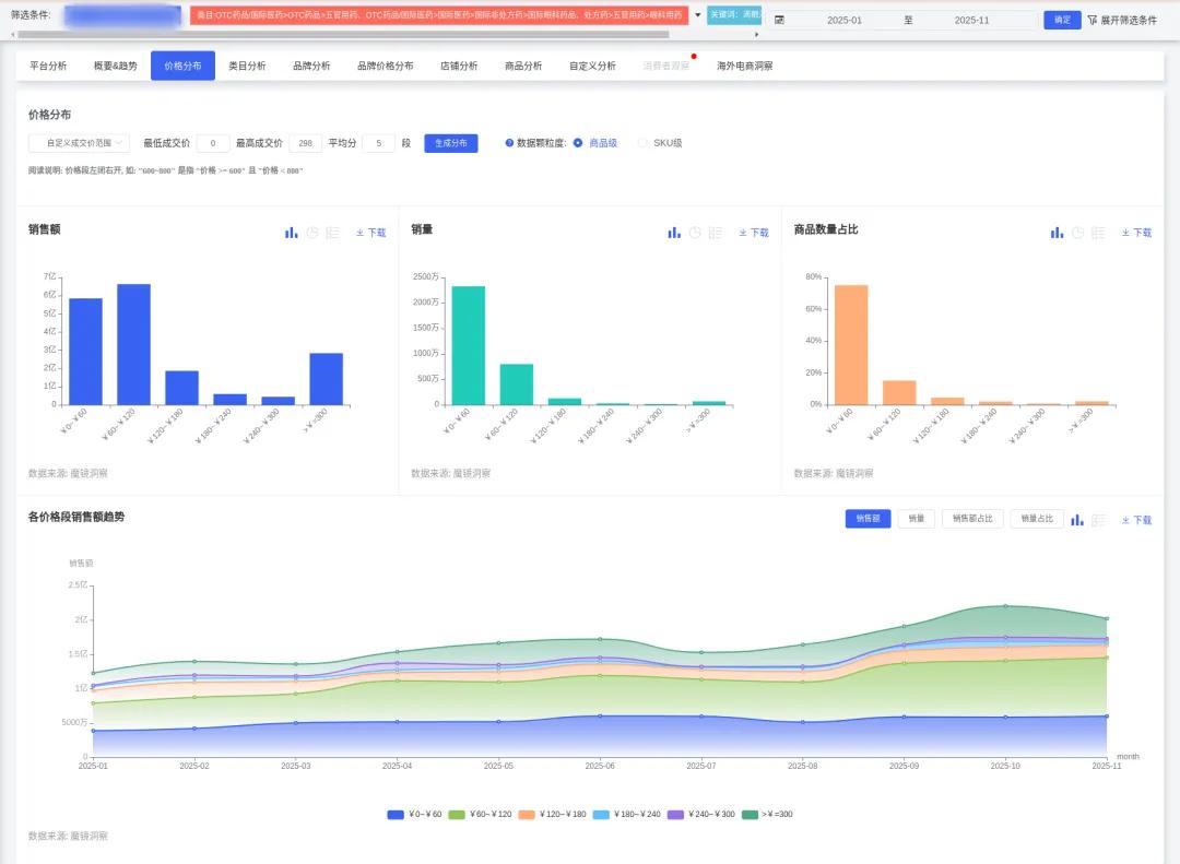 价格段分布呈现金字塔结构,低价位段占据主导地位。0-60元价位段销量占比69.02%,销量达23,241,010件;60-120元价位段占比23.76%,销量8,001,775件;120元以上价位段合计占比仅7.22%。值得注意的是,60-120元价位段占比从1月的22.22%上升至11月的27.54%,增长5.32个百分点,显示消费升级趋势正在形成。高端市场(≥300元)占比稳定在2%左右,无明显增长趋势,表明超高端产品渗透仍需时日。