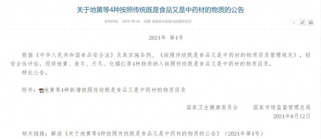 从政策端到市场端,药食同源赛道的热度也持续攀升。2024年,国家卫健委公布的“按照传统既是食品又是中药材的物质”目录,将地黄、麦冬、天冬、化橘红4种物质纳入目录。据公开渠道信息,截至2025年,该目录已扩容至106种,为养生饮品等产品的合规创新提供了更充足的原料选择基础。
