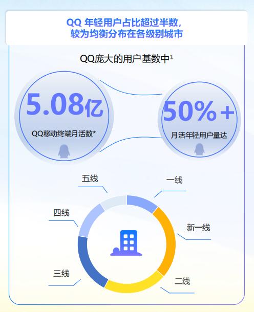 其一,用户基数庞大、年轻化且付费能力突出。《年轻世代2026QQ社交行为洞察报告》数据显示,QQ移动终端月活数高达5.08亿,其中年轻世代占比超50%,且年轻群体的游戏付费能力与消费意愿均相对突出,近半年游戏消费比例可达45%。此外,报告披露的用户画像显示,QQ用户在各线城市分布相对均衡,其中一二线城市用户占比过半。