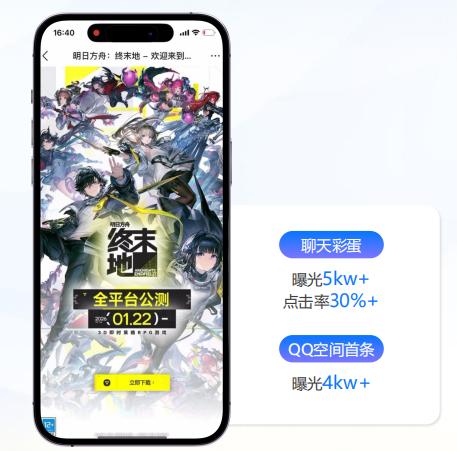 以二次元手游《明日方舟:终末地》为例,其与QQ开展全场景营销合作,将对话框关键词彩蛋与QQ空间全幅沉浸式广告结合,既通过聊天彩蛋的 “惊喜感”触发用户主动分享,又借助空间全幅广告强化品牌认知,最终彩蛋曝光量超5000万次,点击率超30%,远超行业平均水平。