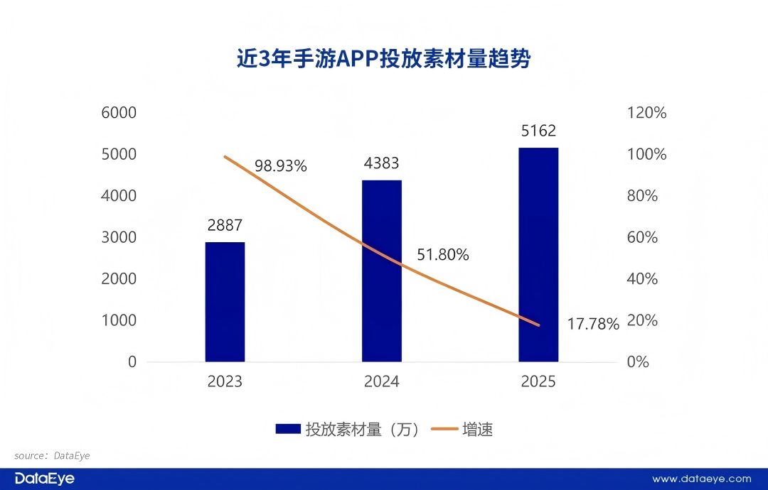 DataEye研究院《2025年度手游APP买量数据报告》显示,近3年手游投放素材量持续增长,2025全年突破5162万,但增速显著下滑。这一数据反映出,国内游戏行业高强度买量竞争下,“追流量”已成常态,但增速下滑也凸显流量红利枯竭、买量成本攀升等核心痛点,仍困扰多数游戏厂商。
