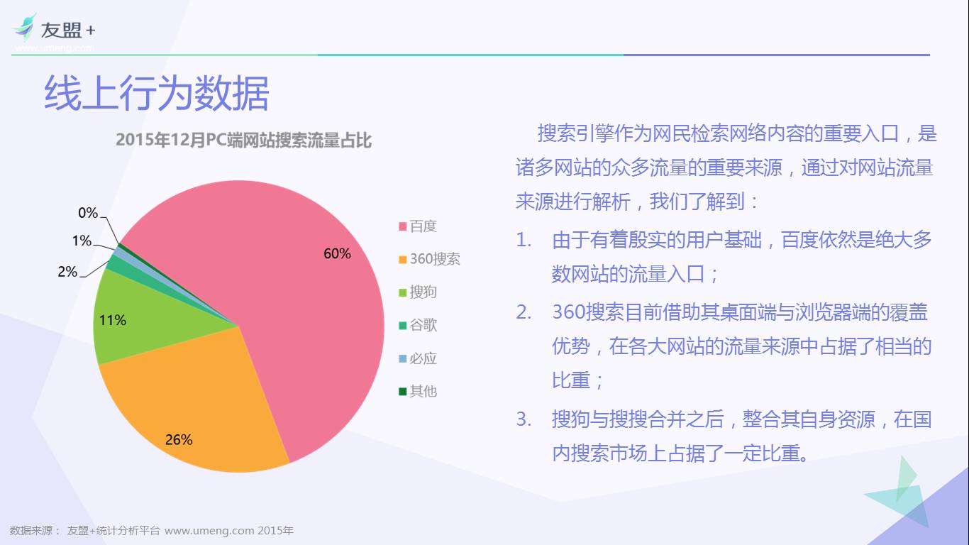 360搜索目前借助其桌面端与浏览器端的覆盖优势,在各大网站的流量来源中占据了相当的比重。搜狗与搜搜合并之后,整合其自身资源,在国内搜索市场上占据了一定比重。