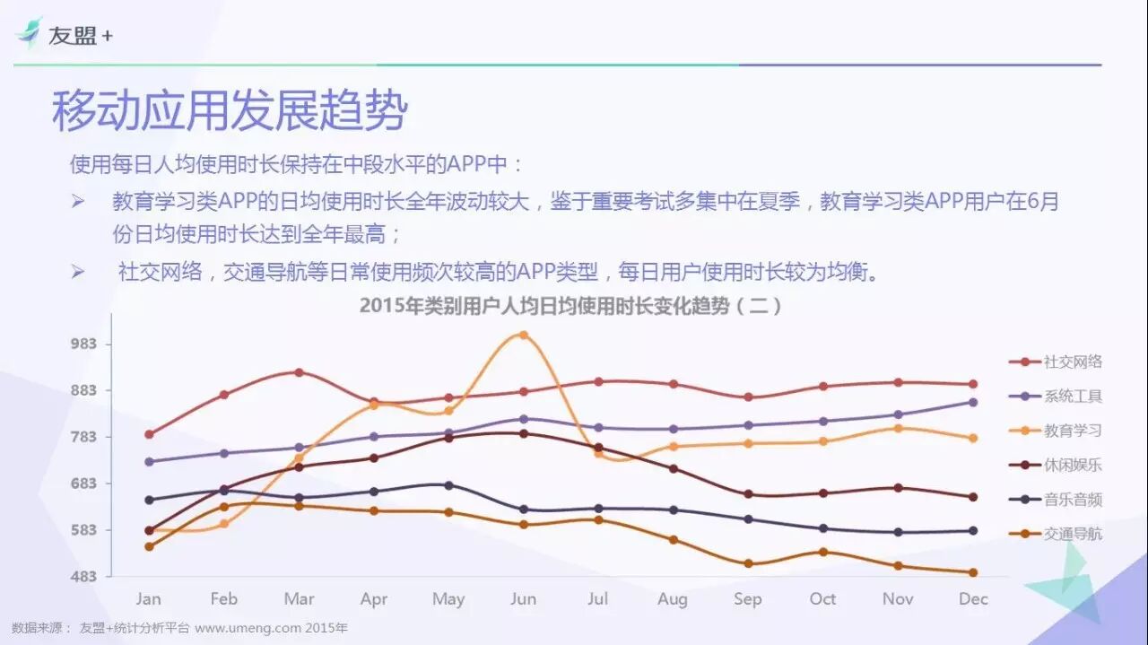 通过查看类别用户APP人均使用时长发现,场景应用会大幅驱动用户使用APP。例如教育学习类APP的日均使用时长在2015年波动最大,其中5月至7月份日均使用时长达到全年最高,此时正值重要考试集中期。