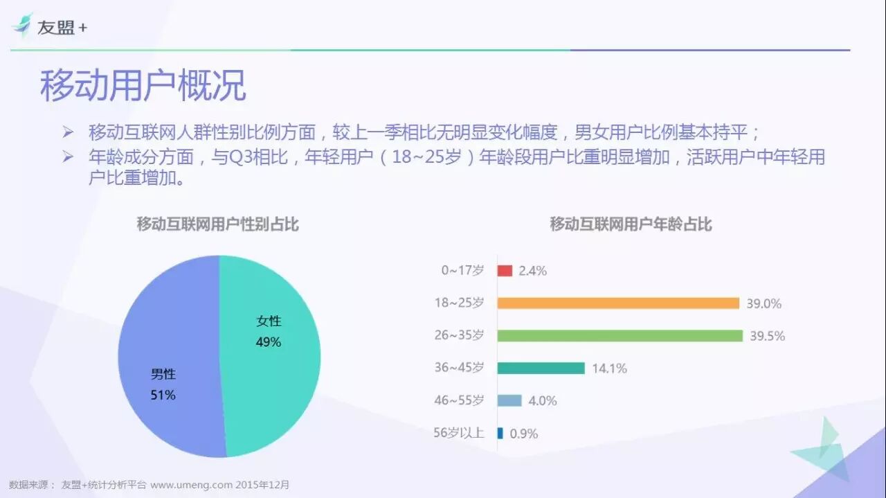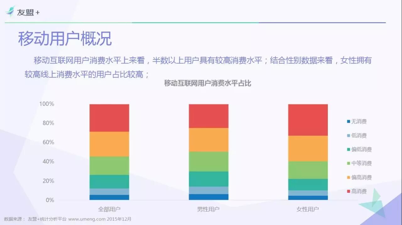 用户结构方面,80、90后是目前移动互联网的主要用户群体,且大多移动用户都具备一定的线上消费实力。相较之下,女性用户高消费占比较男性用户高6%。而低消费以及无消费占比,男性用户较女性用户高5%。