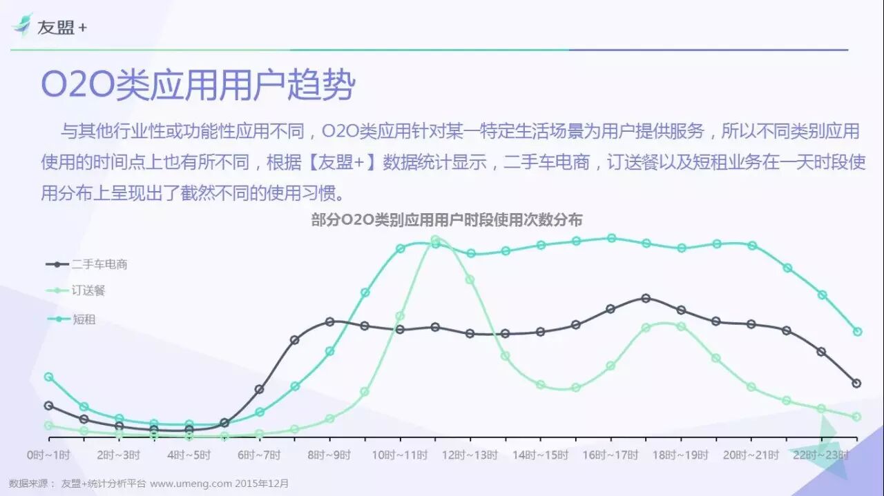同时与其他行业性及功能性应用不同,O2O类应用针对某一特定生活场景为用户提供服务,所以不同类别应用的用户使用时间也有所不同。通过数据显示,二手车电商、订送餐及短租业务在一整天时段的使用分布上呈现出截然不同的用户使用习惯。其中订送餐业务变化最为明显,用户使用集中在10时至13时,以及17时至20时。