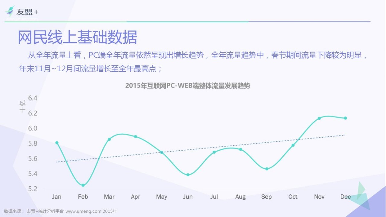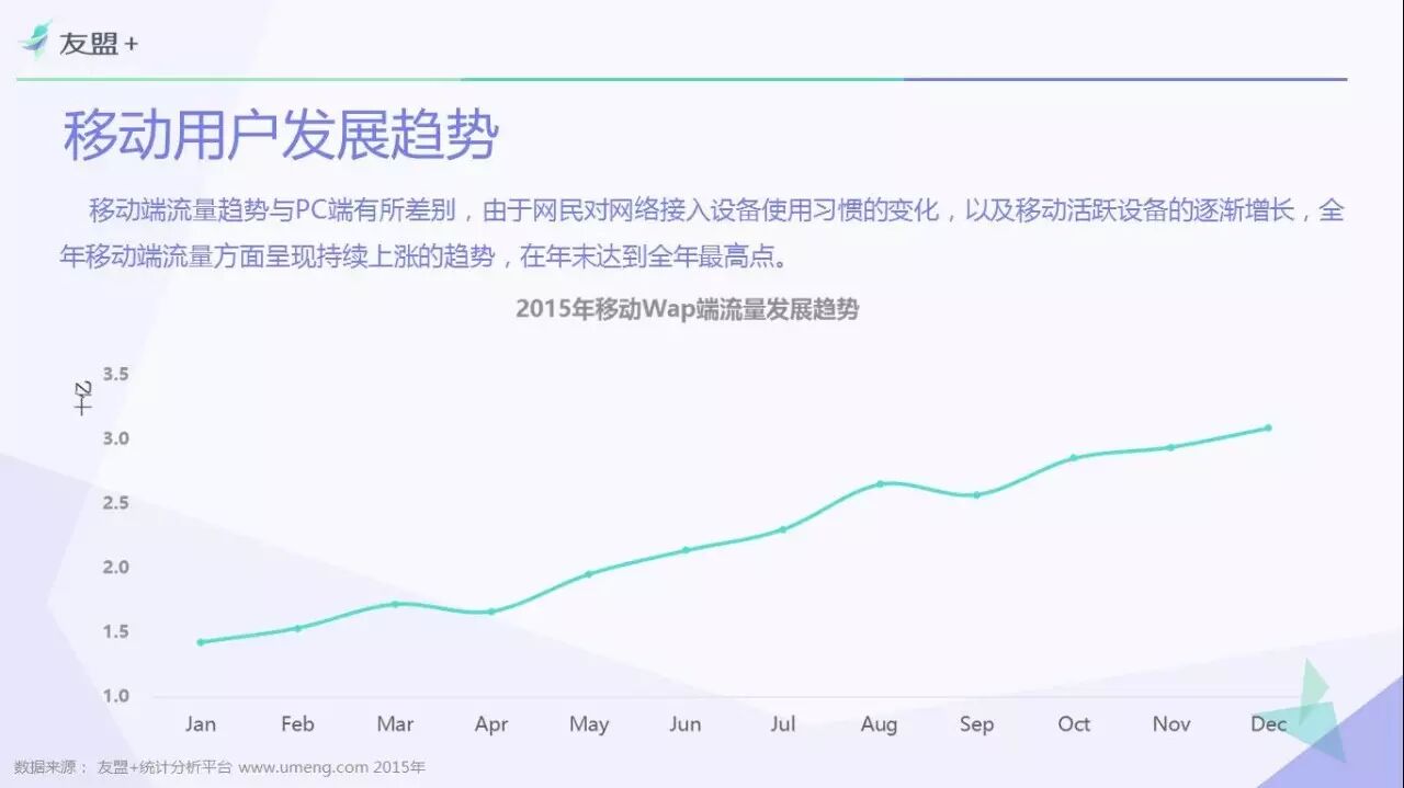 相比移动端(WAP),PC端(WEB)的流量趋势起伏较大,但总体依然呈现出增长的大趋势。尽管2015年移动端(WAP)流量增长50%,突破30亿,但对于PC端(WEB)流量而言仅是其二分之一。