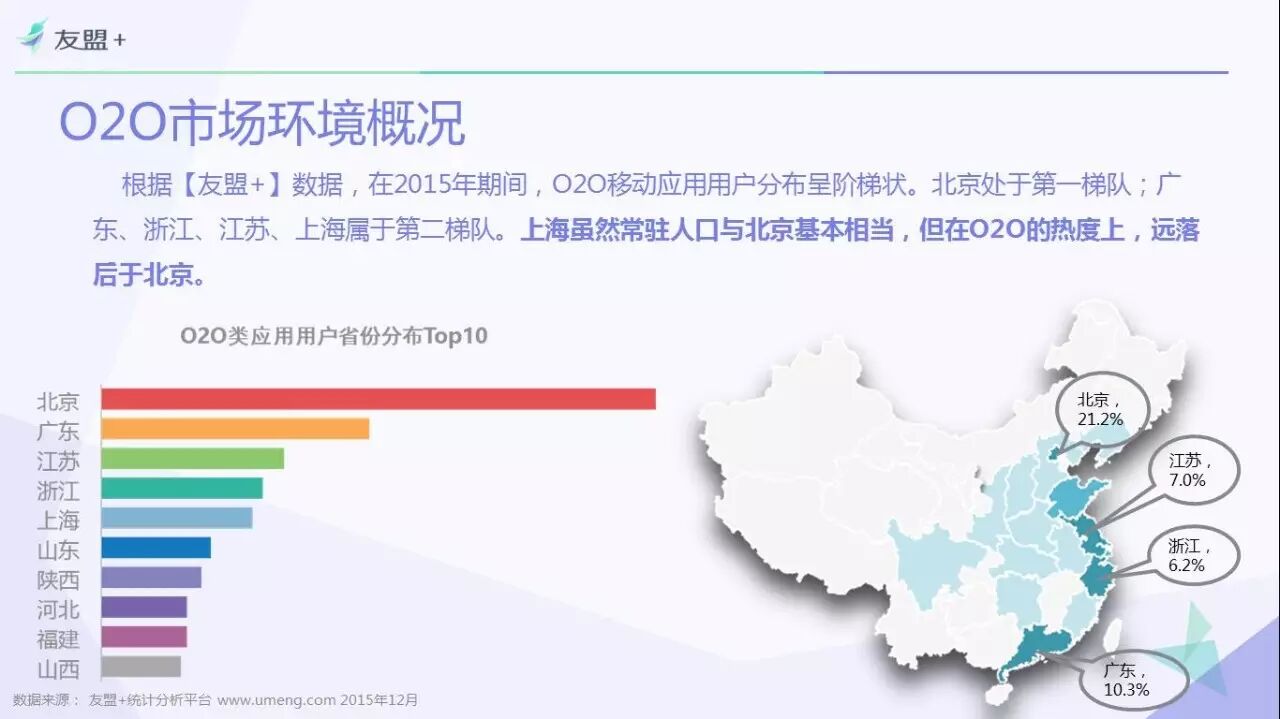 通过查看O2O移动应用用户数据及地域分布发展,【友盟+】发现在2015年期间,国内O2O移动应用用户呈阶梯状分布。北京处于第一梯队,用户规模最大;广东、浙江、江苏、上海属于第二梯队。上海虽然常驻人口与北京基本相当,但在O2O的热度上,远落后于北京。