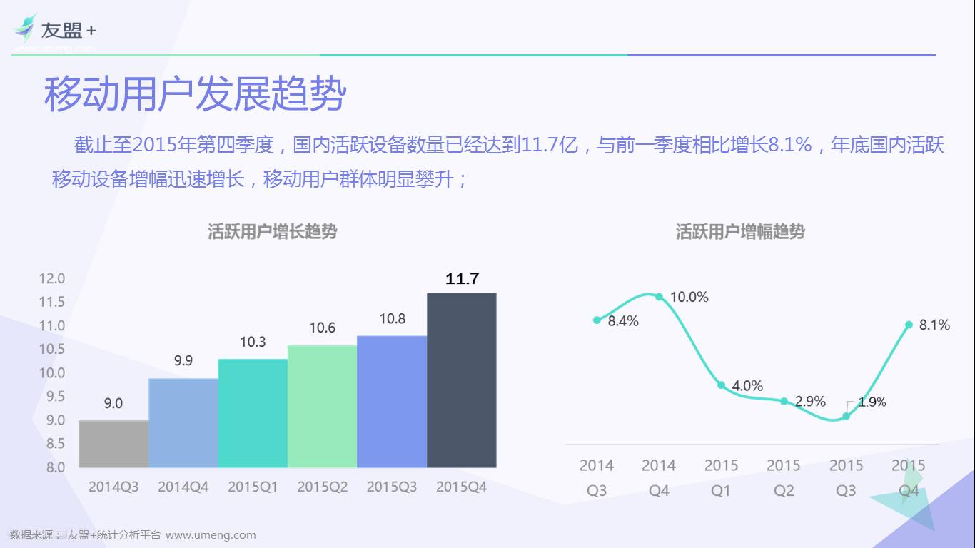 报告显示:2015年,我国网民线上浏览呈现明显上升趋势,约有740万个网站站点共生成PV量超2.91万亿,其中包含PC端与移动端网页。同时,我国活跃移动设备数量在2015年底已达到11.7亿,较2015年第三季度增涨8.1%,较2014年增长18%。