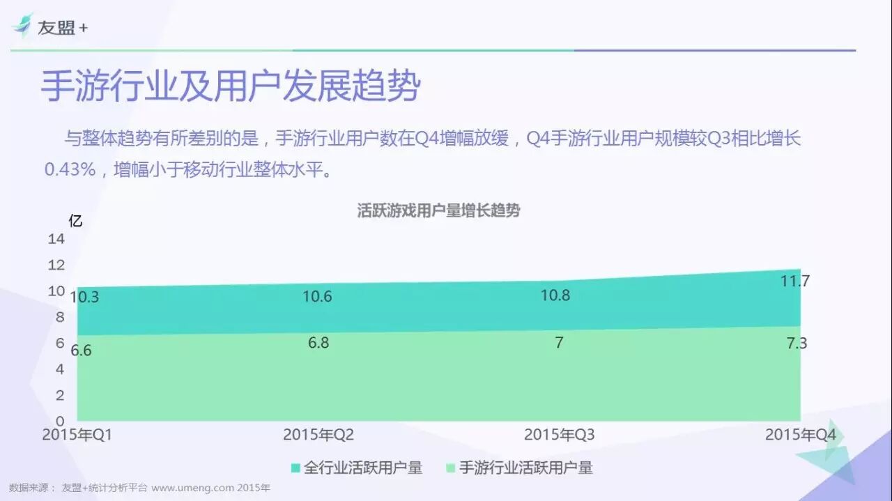 手游作为移动应用中最为重要的类别,已经形成单一产业,从2015年数据来看,手游发展趋势与移动互联网整体趋势略有差异。手游行业用户数在第四季度增幅放缓,第四季度手游行业用户规模较第三季度相比增长0.43%,增幅远小于移动行业整体水平。