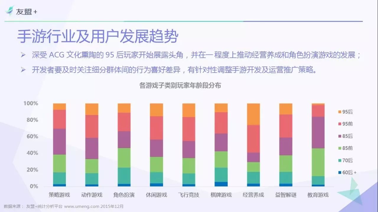 深受ACG文化熏陶的95后玩家在2015年开始崭露头角,并在一定程度上推动了经营养成与角色扮演类游戏的发展。开发者需及时关注细分群体间的行为喜好差异,有针对性调整手游开发及运营推广策略。