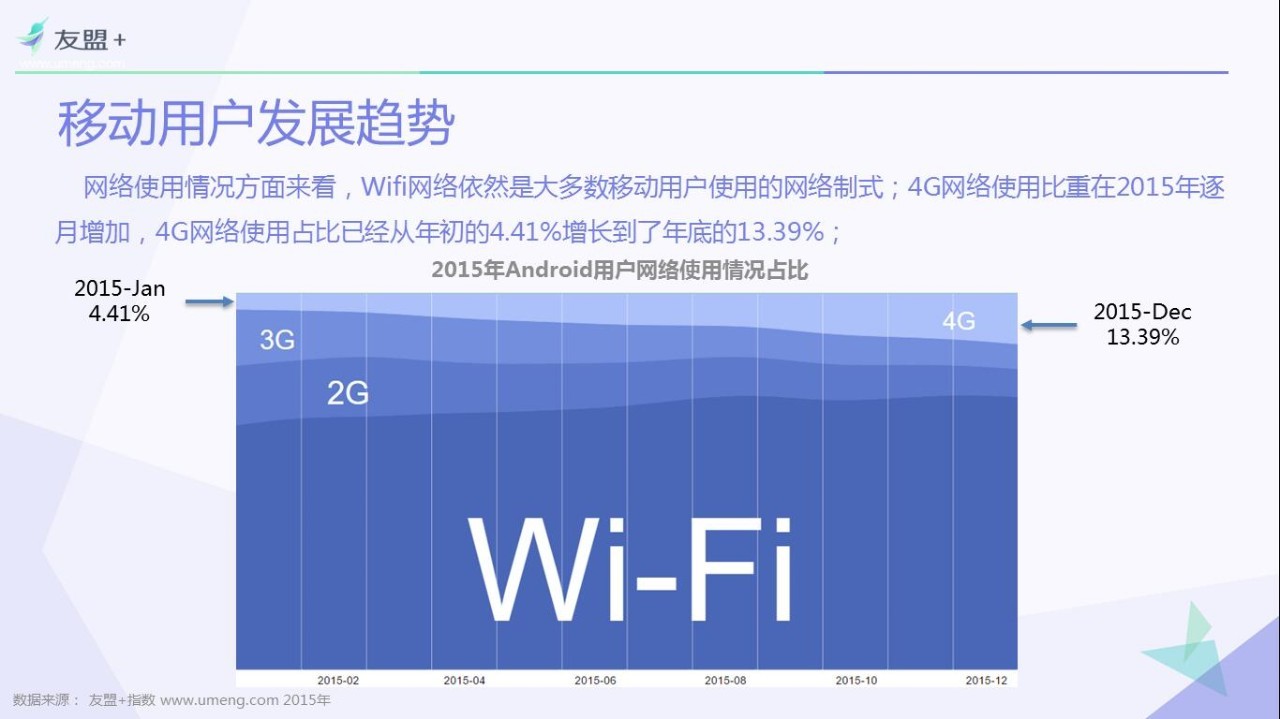 从过去一年Android移动用户的网络使用情况上来看,Wifi依然是移动设备接入互联网的主要方式。移动网络方面,4G网络的使用比重逐渐增加,在过去的一年中4G网络使用量已经超过3G与2G网络的使用量。