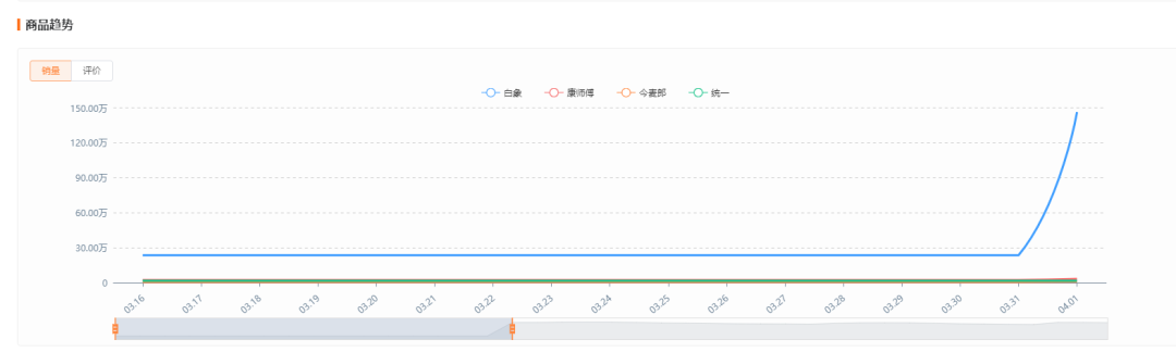 从西瓜微数——品牌对比商品销量趋势可以看出,白象都领先于其他品牌,更是在3月31日之后迎来爆发增长,可以看出在这个时间段之内,白象的付费转化率是高于其他的品牌。
