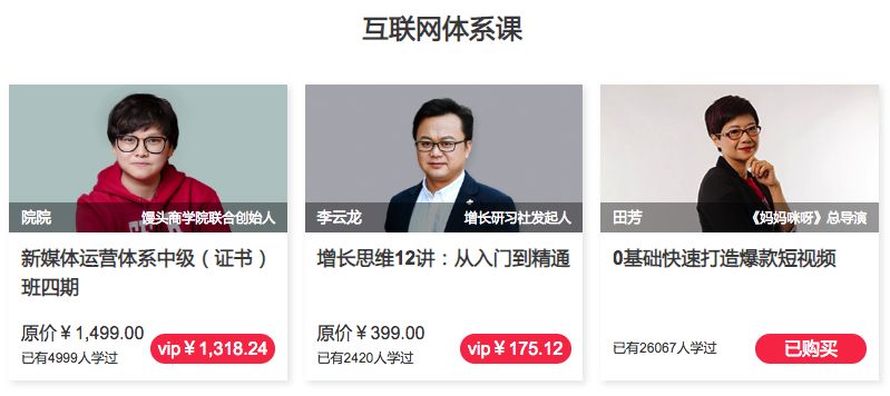 比如说馒头商学院有关于新媒体、短视频、运营等互联网的体系课,以及针对职场人快速精进的课程,去满足不同人群对多种知识的需求,你在我一个地方就都可以买到,这样对平台来说它就实现了复购。
