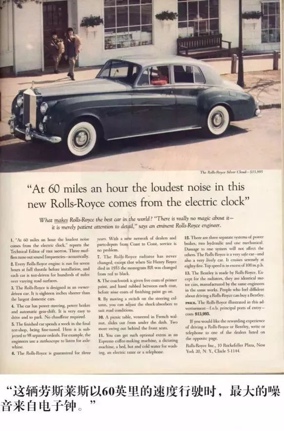 但奥格威自己也坦白说,当我接受劳斯莱斯时,我花了三周时间大量阅读汽车资料,最后看到这句:在时速60公里的车上,最大的声音来自电子钟。