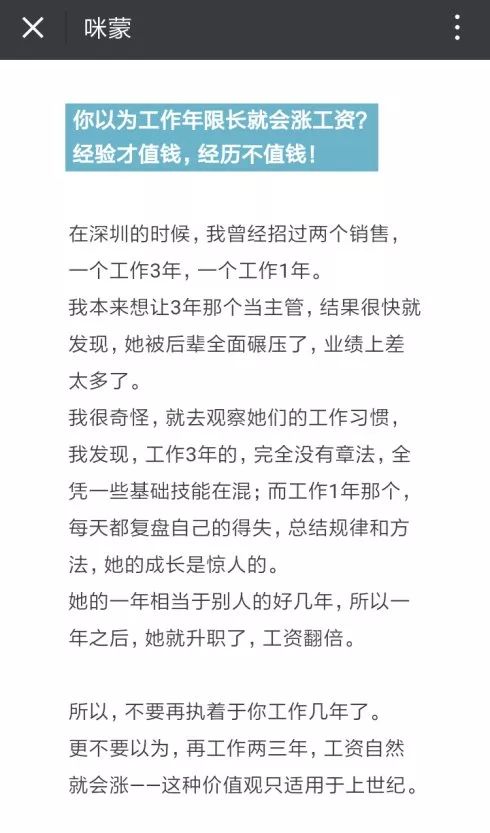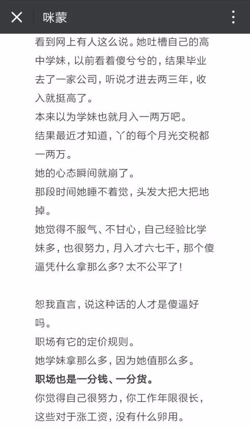 这里咪蒙给我们交代了一个非常普遍的现象——认识的人比自己赚钱多,你觉得自己很努力,你工作年限很长,然而这些对于涨工资,没有什么卵用。