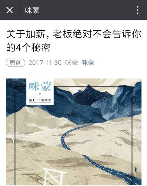 前不久,咪蒙在其公众号推送了一篇名为《关于加薪,老板绝对不会告诉你的4个秘密》的广告推文,主要是卖她首次的加薪课《咪蒙教你月薪5万》。