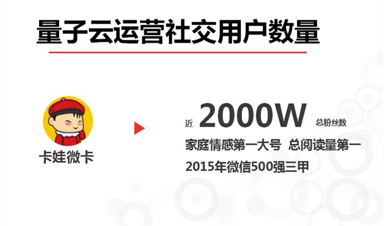 以我们的量子云科技·卡娃微卡为例,作为一个致力于为用户提供优质数字内容和服务的新媒体平台,散播100个微卡(基于微信的电子贺卡)种子和各种相册,通过情感社交H5互动应用,云机构的富媒体表现形式,成为移动互联网时代亲人和朋友之间传递感情的载体,丰富了用户的沟通与生活,在构建新媒体创新生态方面已经先行一步。