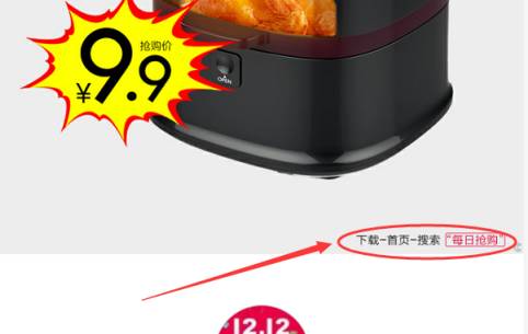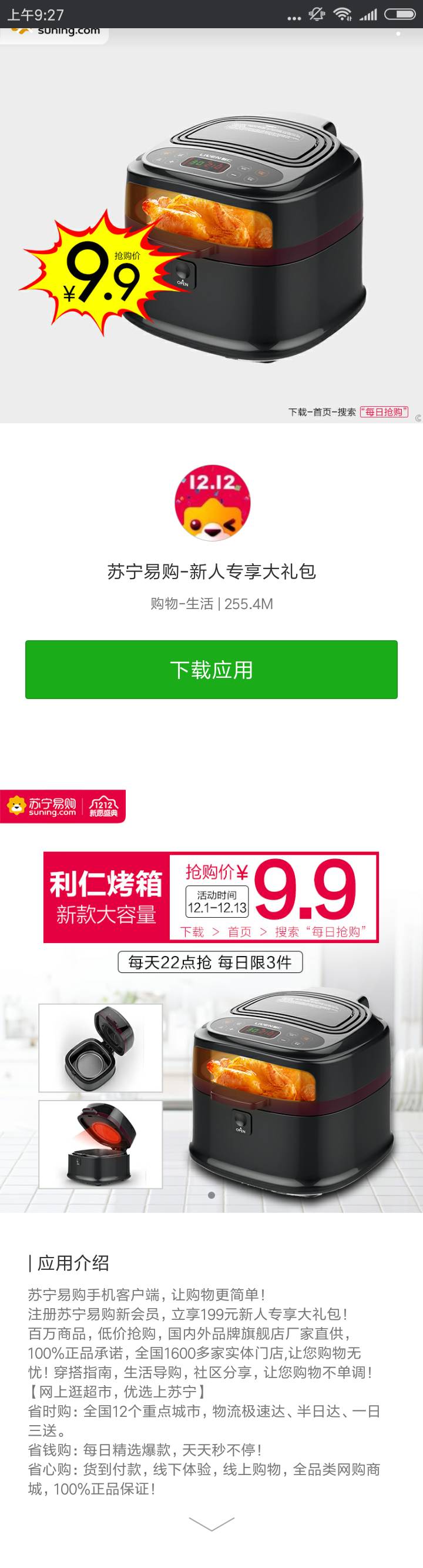 首屏跟广告图文完全一致,还是那个烤箱,想要的话点击下载苏宁易购,图片右下角和落地页第二屏也都说明了怎么找到这个特价烤箱。
