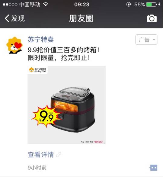 这是苏宁易购的广告截图,很简单,只放了一个单品:烤箱,对电器和家居类产品关注的用户直接被吸引。