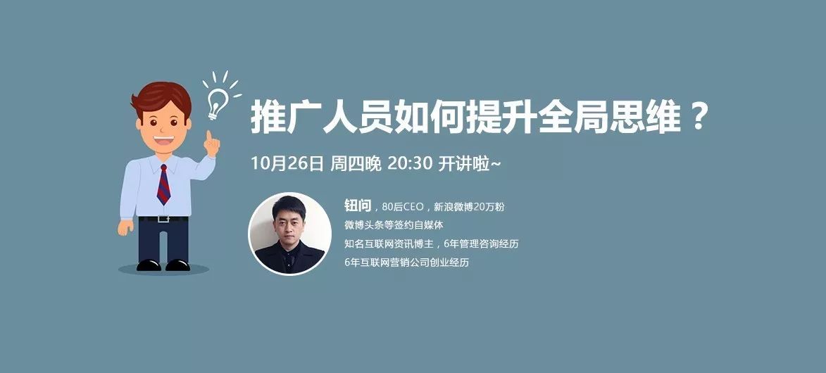 我们公司也有很多推广人员,我发现一个普遍的问题就是没有全局的营销思维,都钻在某个点上,所以我决定本次分享就拉升下大家的全局思维,让大家能够从更高的高度看待自己所从事的推广工作,也会更加有利于自己的职业生涯发展。