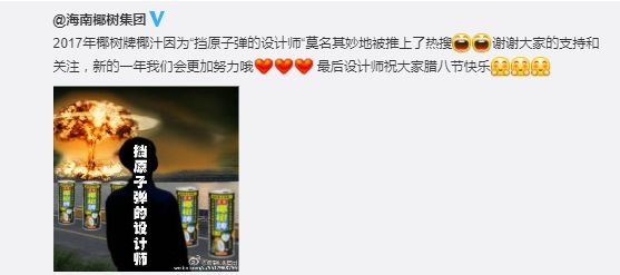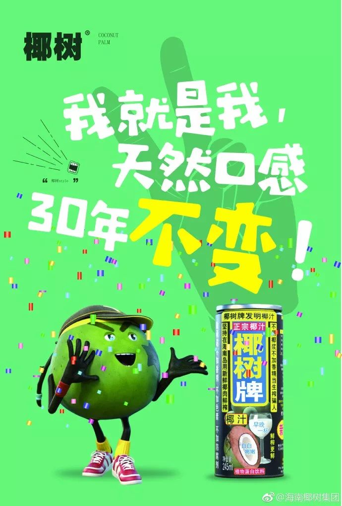 例如在年初,椰树牌椰汁如期更换了包装上的广告文案,从原来的“29年坚持在海南岛”变成了“30年坚持在海南岛”,传递品牌30年存续坚持的精神,也就是说凡是2018年1月1日之后生产的椰汁,在包装上就可一目了然,于是在自媒体扩散传播的语境下,不少网友考赞其态度真严谨!