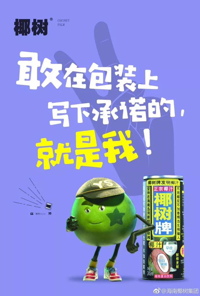 再例如,在上个月中旬,椰树集团官微发布了一支名为《椰树Style》的嘻哈风格卡通广告片和一套9宫格海报,基本上是用视频和海报媒介的方式将“正宗”、“配方没换”、“天然口感30年不变”、“不加香精不勾兑”等内容又重新演绎了一遍,强调喝椰汁认准椰树,继续锁定品类第一的位置。