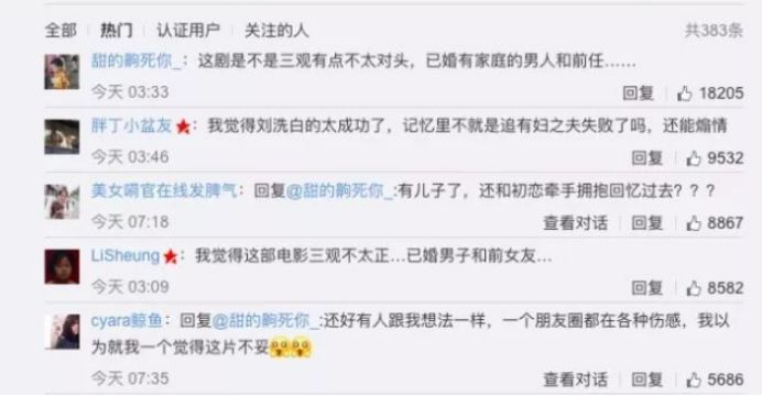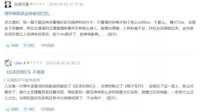 同时,过于套路的故事、并不平等的爱情、用力过猛的煽情文艺台词都让这部片子在质量上并没有宣传的那么上佳。而因为情怀营销被诓进影院的挑剔观众们自然会产生一种“受骗感”,对口碑带来的反噬效应也非常明显。