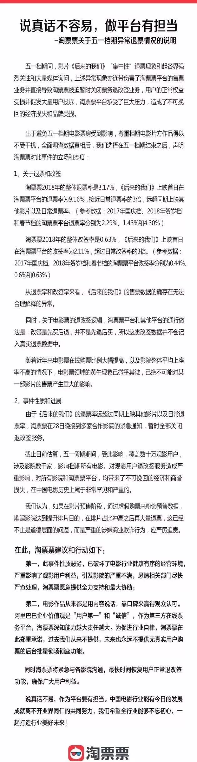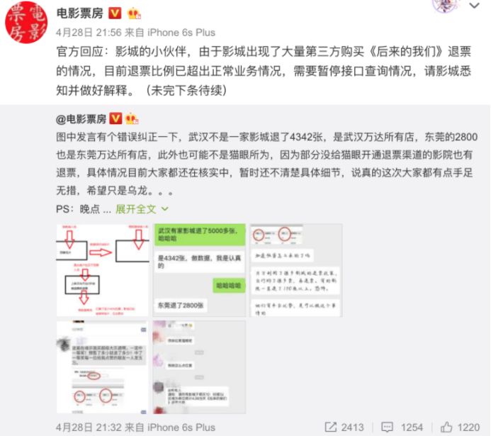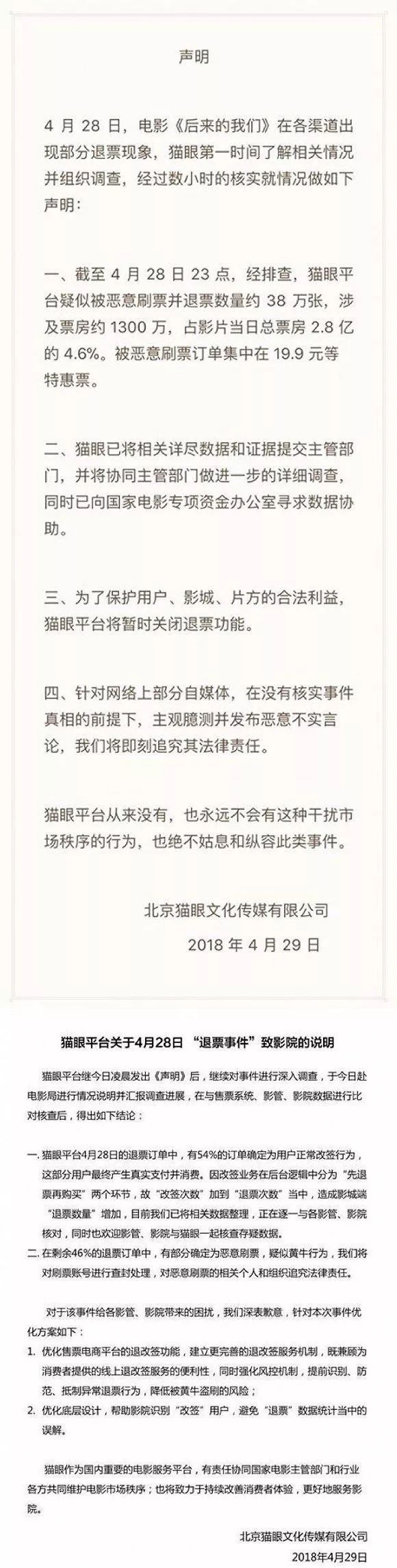 4月29日凌晨,猫眼电影官方微博也发布了声明,表示猫眼平台上《后来的我们》疑似被恶意刷票并退票 38 万张,涉及票房 1300 万,占《后来的我们》当日总票房 2.8 亿的 4.6%。随后,猫眼还专程发布了一份声明,声称这样的情况与自身无关。
