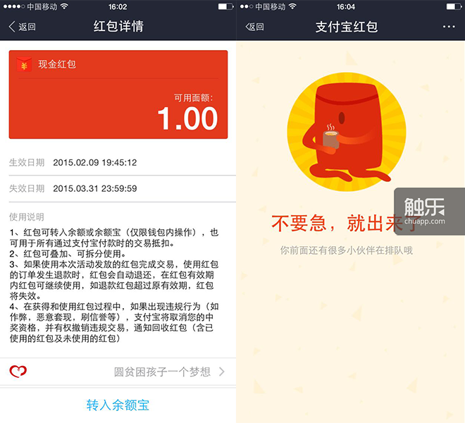 在大约半个小时后也就是下午四点时,支付宝将会开启第二轮红包活动,据支付宝宣称,这轮红包活动取消了代金券,他们会发出实打实的2500万——但这活动并不仅是钱的事儿,如果上述问题没有改善,恐怕多出的1500万也并不能解决用户根本的抱怨。而这也将直接关系到其后整个红包营销活动的成与败。
