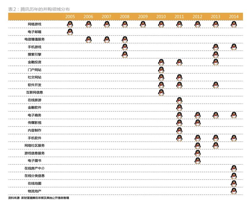 腾讯的投资并购史,几乎可以等同于其扩张史。根据腾讯历年年报所披露并购项目涉及的细分行业,新财富汇总梳理发现,早期腾讯并购所涉及的领域有限,越到后期其投资布局日趋分散,几乎对互联网的各个细分行业皆有染指(表2)。