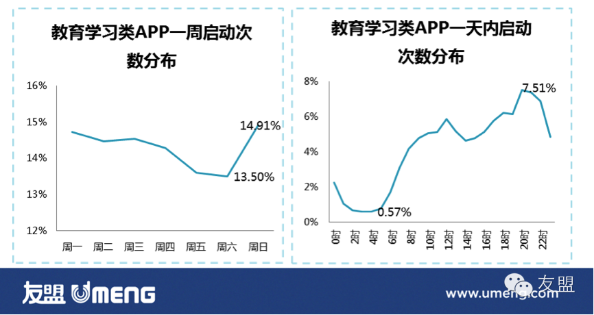 今天教育类 App 猿题库宣布完成 D 轮融资,再次引发行业的关注。和电商导购的曲线有所类似,教育学习类 App 的用户在周五周六外出活动时,使用教育学习类 App 的频率下降到最低,从周日起回升。每天的使用高峰在晚餐后 20:00-21:00 出现。不难理解,目前有许多教育学习类 App 针对在校学生开发,周末大家更愿意玩耍和休闲,而平时晚上则需要温习功课,周日晚则是“抱佛脚”的时间。
