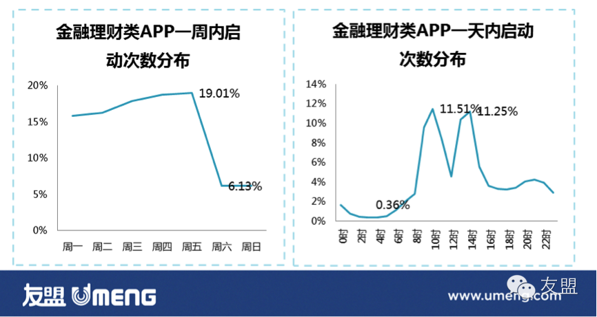 金融理财类 App 的用户使用频率规律性非常显著。从周一到周五使用频率基本相当,周末出现大幅下跌。每天 9:00 - 10:30 ,13:00 - 14:30 出现使用高峰,股市开市时间显然影响到人们使用金融理财类 App 的时间。给这一类用户定点推送相关的资讯,也是一种不错的提升用户粘度的方式。