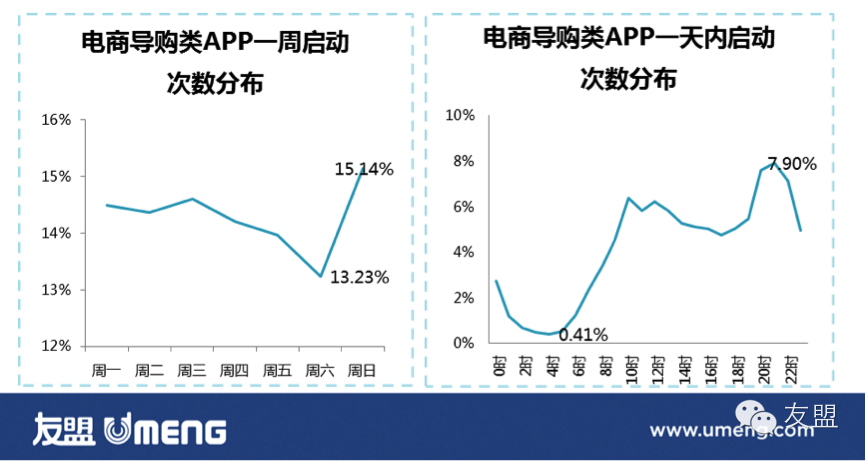 其次,在时间分布方面,友盟对四个热点垂直领域用户的启动时间在一周和一天内的分布分别作了观察。