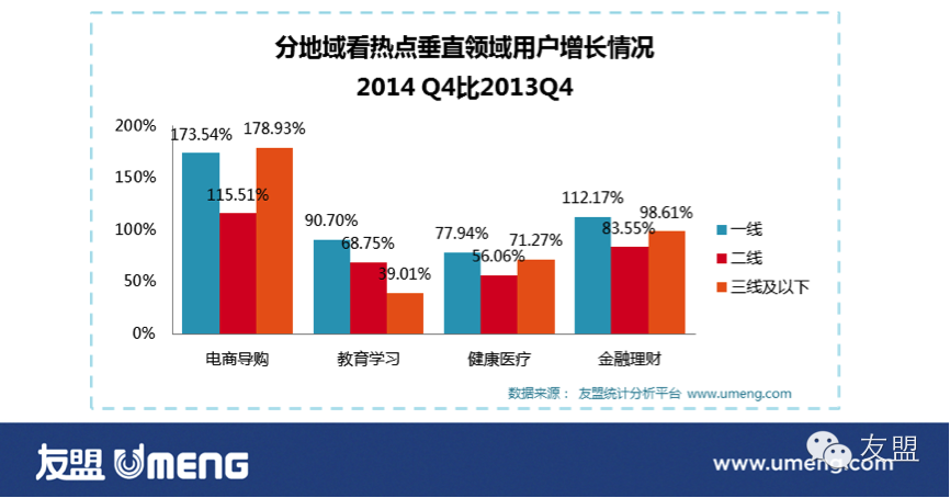 此外,这四类垂直领域用户从 2013 年第四季度到 2014 年第四季度增长的地域分布也值得注意。数据显示,电商导购在各线城市都获得了超过翻倍的增长,其中在三线及以下城市获得的增长最高,为 179 %。金融理财在各线城市的增长也都很显著。