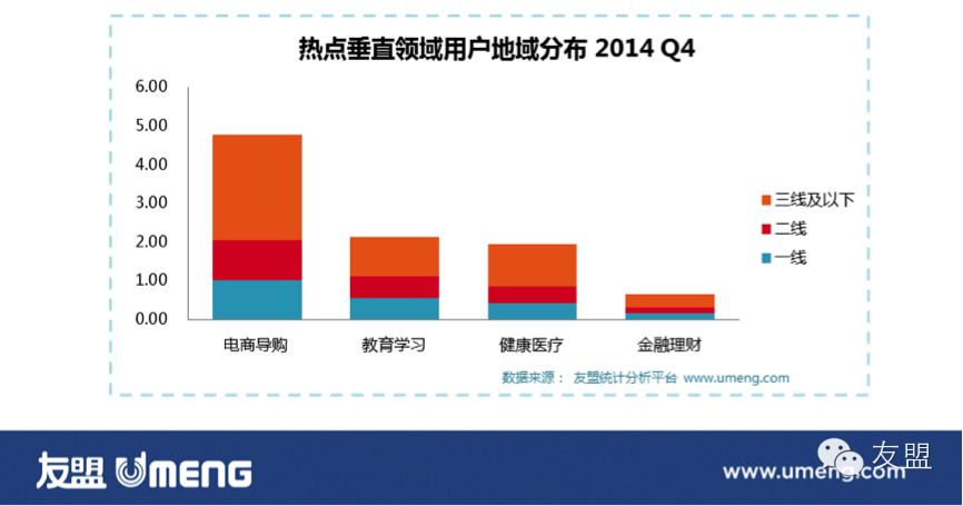 一个基本情况是,相对来说电商导购类用户数最多,其次是教育学习,健康医疗,而金融理财还属于新兴领域。无论是哪个垂直领域,三线及以下城市用户的比例都占绝对多数。