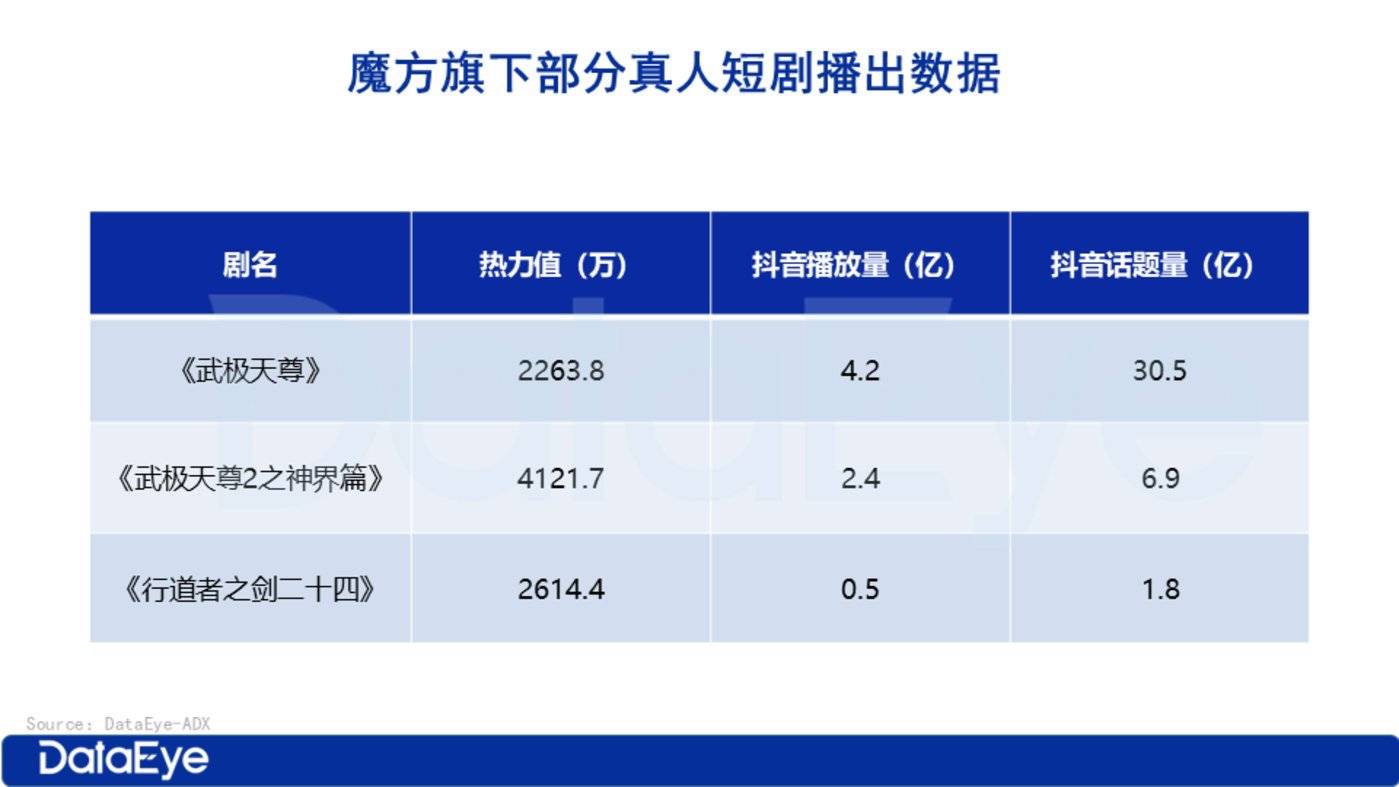 支撑这一规划的核心基础,是充足的IP储备。据DataEye-ADX数据,公司关联短剧超500部,积累了大量可改编的真人IP;其中《武极天尊》系列真人短剧表现突出,抖音播放量突破6亿次,话题量近40亿次。