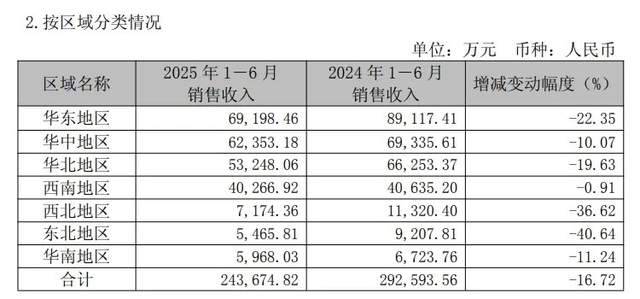 值得一提的是,这是养元饮品近三年来首次出现营收与净利润双双下滑,具体到区域上,华东、华中、华北、西南、西北、东北、华南七个大区销售收入全线下滑,公司指出了业绩下滑的核心原因正是核桃乳产品销量的持续萎缩。