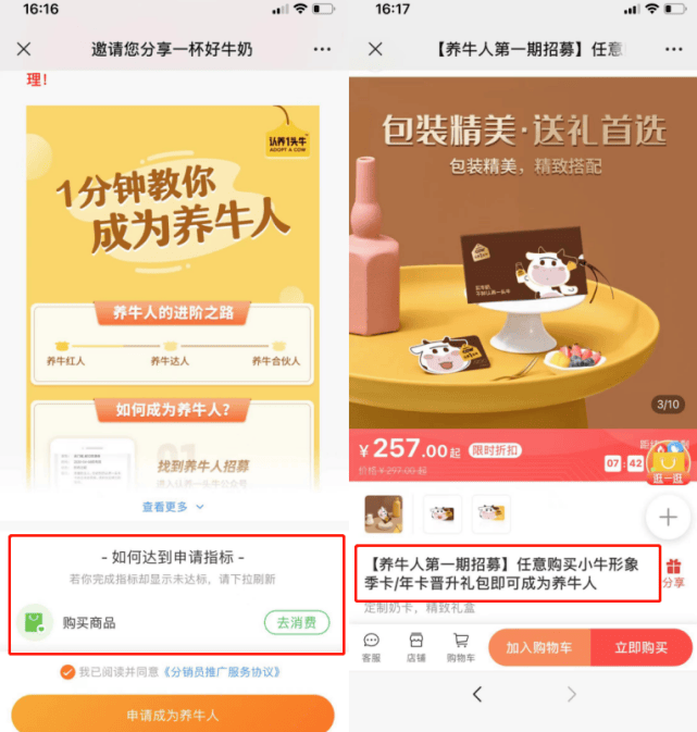 此外,品牌还推出了奶卡等多样化营销方式。用户花费297元-1188元成为“养牛人”后,会有销售佣金和邀请奖励,随着推广销售的不断累计,销售佣金比例也会按对应的等级提升,此外还有“下级返佣提成”,粉丝每下一单,都可获得佣金提成。