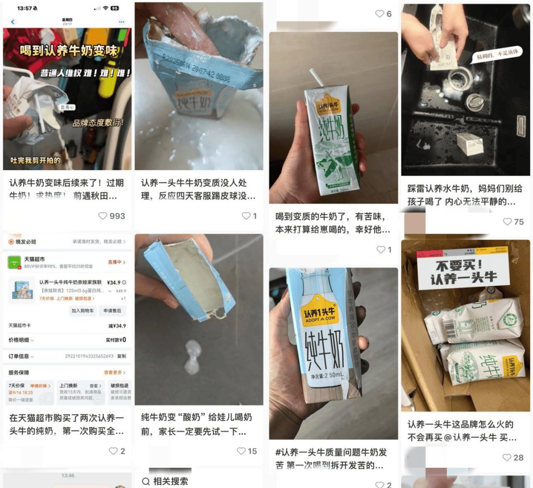 倘若说,巴氏奶品类的缺位凸显了其产业链故事仍需补强的环节,那么,近期频发的食品安全问题,则直指认养一头牛的立身之本,成为其必须正视并彻底解决的生存课题。在社交平台上,不少消费者反馈称,在购买认养一头牛产品后,出现牛奶味道异常、存在异物或包装破损等状况。