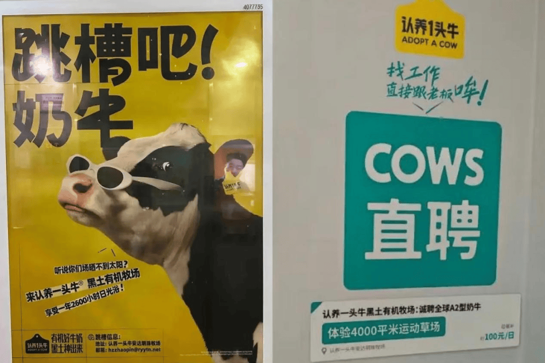 砸下重金的营销风格也让不少消费者反映其“用力过猛”。今年四月,认养一头牛因一则广告被指“嘲讽打工人”而引起舆论风波。该事件源于其推出的“COWS直聘”系列广告,标语如“找工作,直接跟老板哞!”,直接将打工人比喻为牛马,这样的广告让不少消费者感到不适,认养一头牛也该在品牌营销创意与公众接受度之间加强平衡。