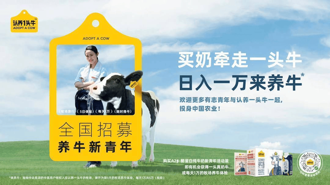 同年12月,品牌在众筹平台推出“牧场共建人”计划,提出“喝牛奶不如认养一头牛”的理念,迅速获得市场响应。该计划设置了不同层级的参与方式:支付2999元可获得奶牛认养权,投入1万元则可成为联合牧场主并享受经营分红。