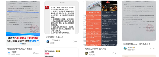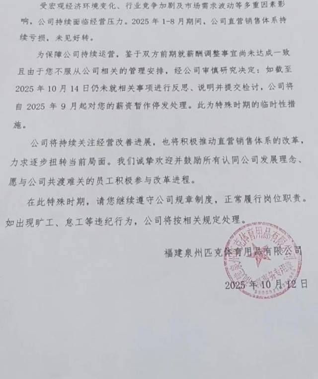 10月13日,多个媒体报道称,有相关员在社交媒体上透露匹克公司向拒绝降薪的员工发出“最后通牒”,要求其在10月14日前提交“反思检讨”,否则将面临停发9月份工资的处罚,并且还贴出了盖了匹克公司红章的文件。