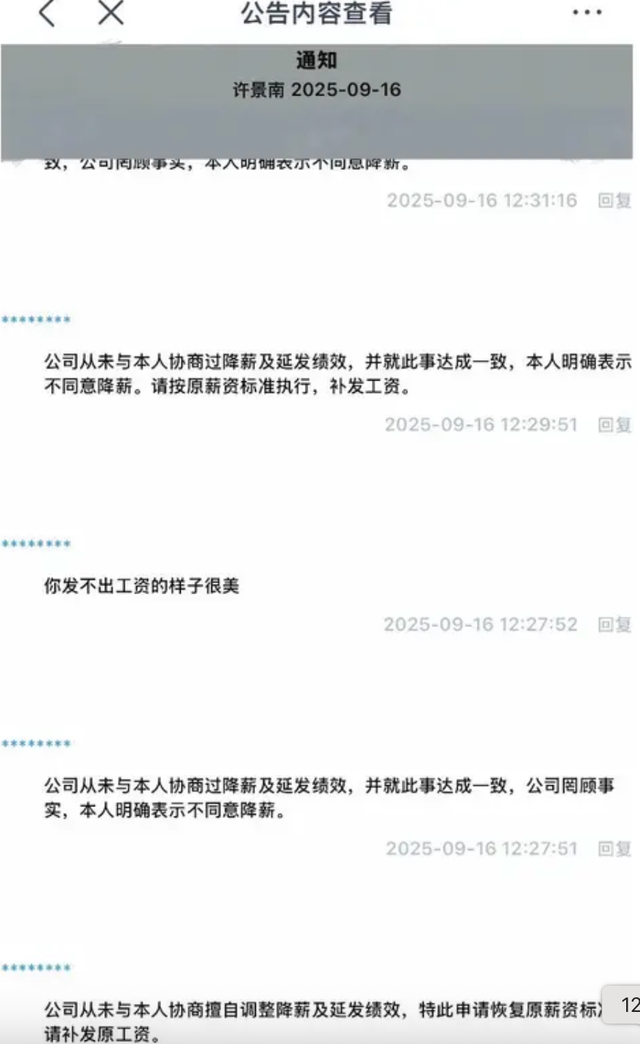 有受访员工表示,9月11号(发薪日前四天)确实有开会讲过降薪一事并提及降薪的幅度。但当时没有征求大家同意的环节,会议也不是全员参加。会后没发布正式的文件公告、也未进行一对一沟通,大家月中发完工资以后董事长才发了那个落款为9月16号的通知。