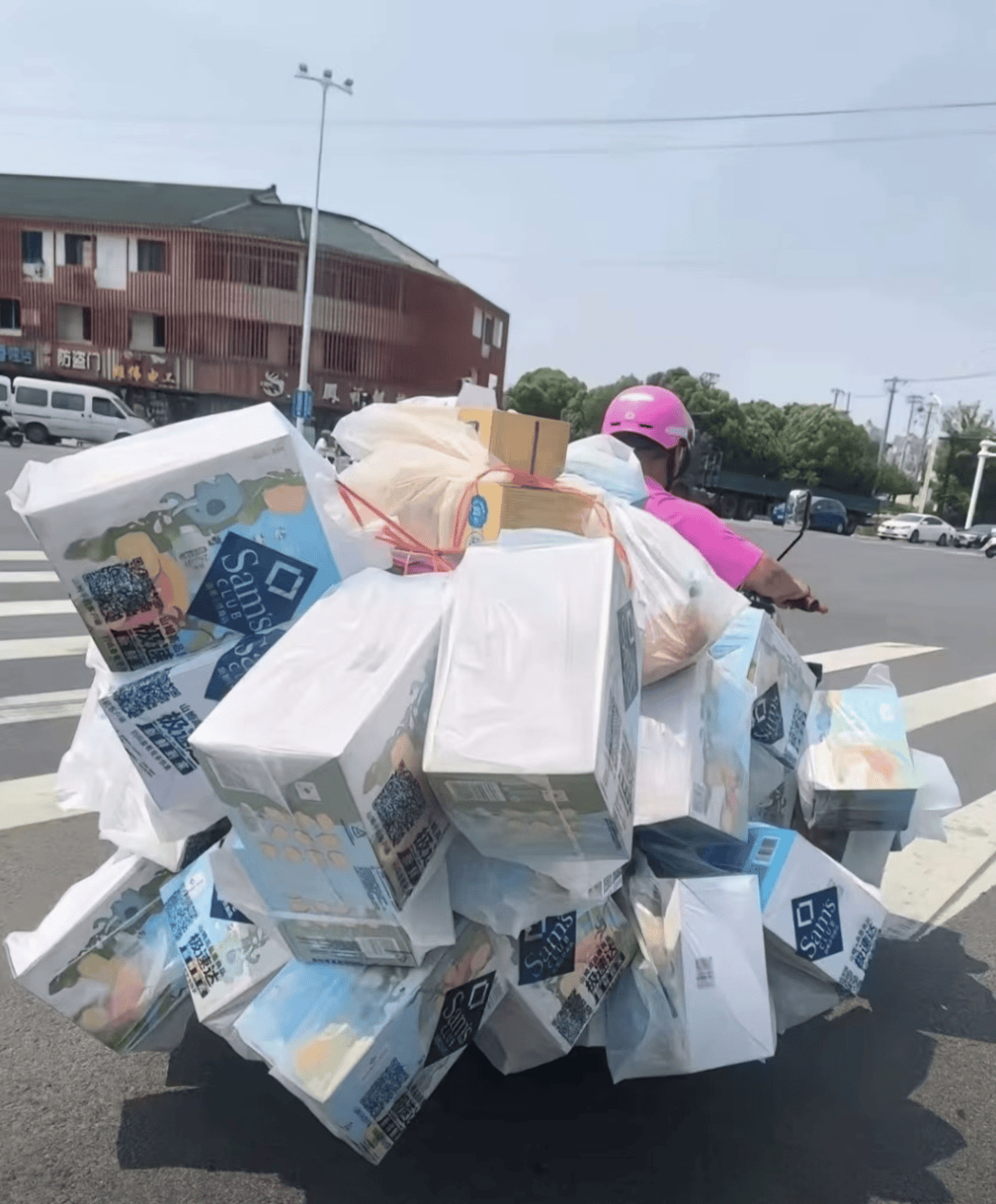 让小谷态度转变的导火索,是近期在社交平台广泛传播的一张现场照片:山姆配送员骑行的电动车货物堆积如山,部分车辆因严重超载已出现明显倾斜。更甚者,这并非孤例。舆论发酵后,全国多地网友陆续晒出相似画面,山姆配送员普遍驾驶着挂满大件货物的两轮电动车,在道路上穿行。