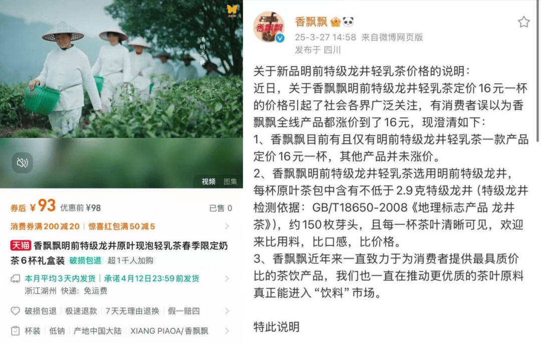 即便在新推的“原叶现泡”系列中,香飘飘试图以“鲜制现喝”对标现制茶饮,并强调原料升级,但定价却逼近中端现制饮品,遭遇大量消费者质疑,官方最终不得不亲自回应。并且在外卖茶饮价格因补贴战大幅下探的背景下,其性价比优势尽失。