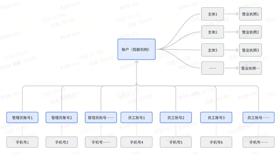 账号体系方面,一个账号可以绑定多个主体(每个主体对应一个营业执照)。一个登录手机号对应一个账号,账号身份分为管理员和员工。